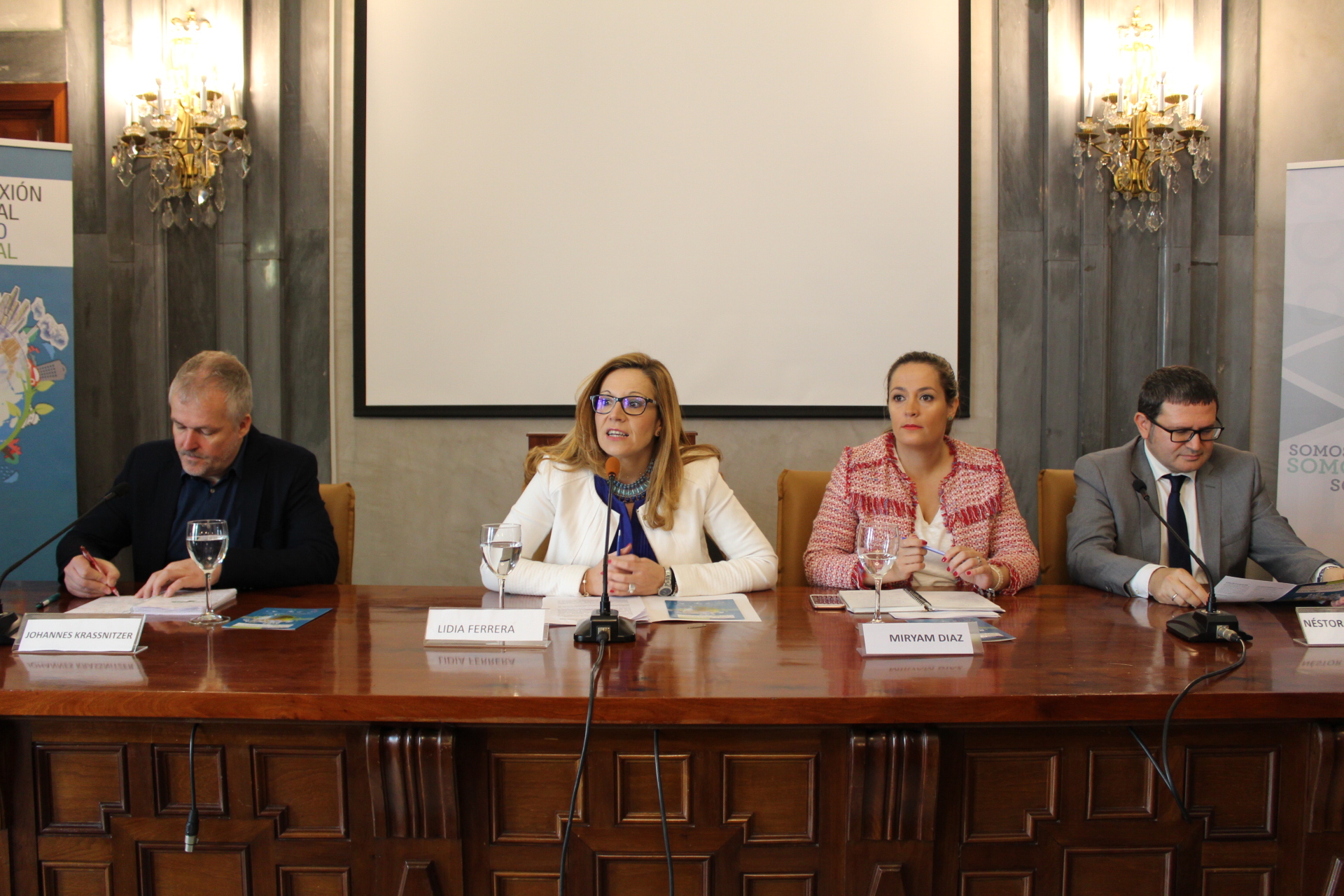 Néstor Fernández, director de la Agencia Andaluza de Cooperación Internacional, AACID, Carmen Castreño, delegada de Economía del Ayuntamiento de Sevilla, Lidia Ferreras, diputada del Área de Cohesión Social e Igualdad de la Diputación de Sevilla y Johannes Krassnitzer, coordinador de la Iniciativa ART-PNUD han abierto el seminario.