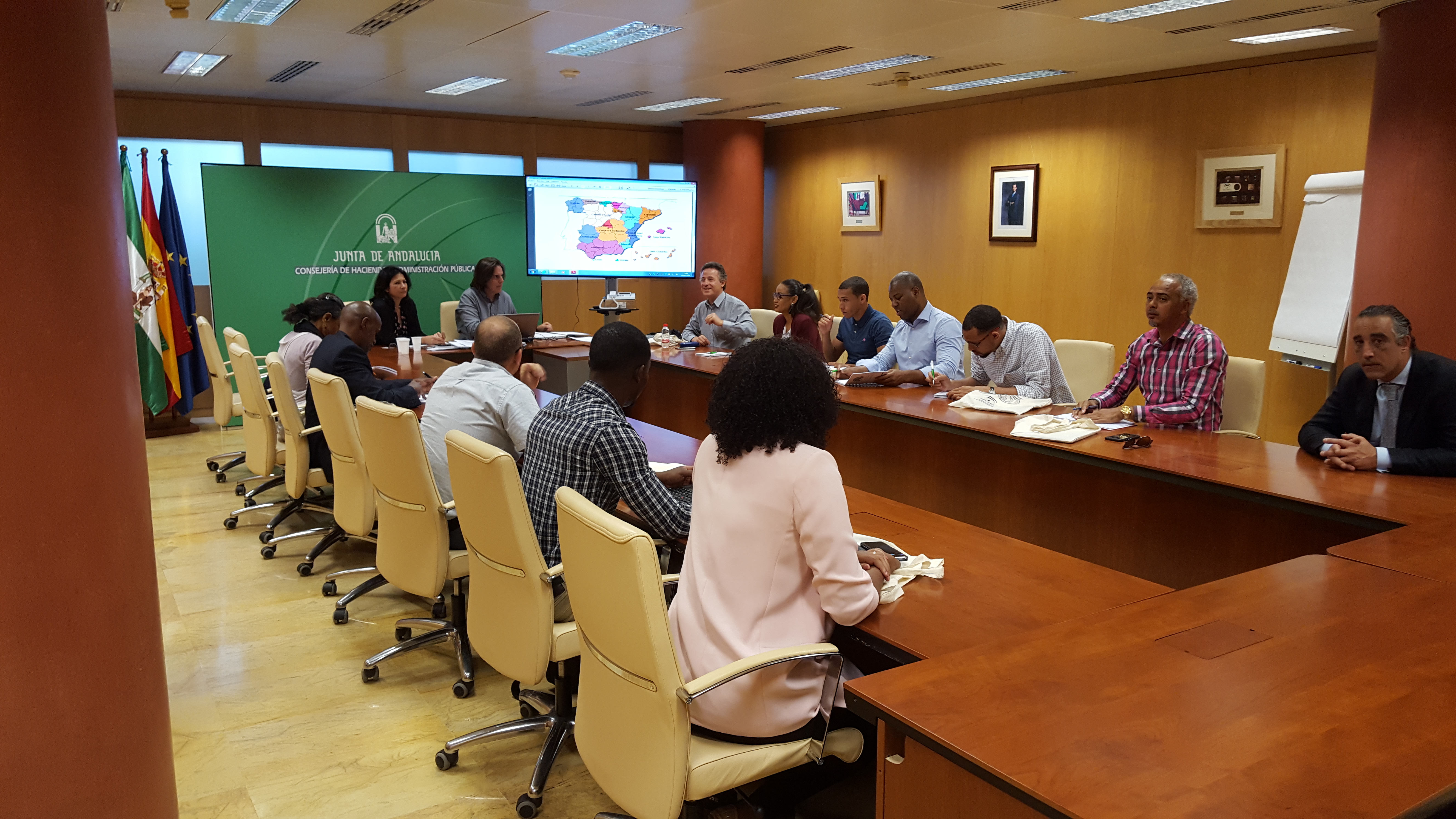 La delegación caboverdiana estuvo integrada por técnicos del Ministerio de Finanzas y secretarios municipales, junto con representantes de la Asociación Nacional de Municipios de Cabo Verde, ANMCV, y de la Unidad de Desarrollo Local del Gobierno; en la agenda se incluyeron reuniones con responsables de ámbito local y regional para conocer las características principales de sistema de gestión pública en Andalucía. Así, el grupo abordó el modelo de descentralización y las competencias que ostenta el gobierno regional con José Antonio Martínez Marín, jefe de servicio de Relaciones Institucionales y Cooperación Interregional de la Consejería de la Presidencia, Administración Local y Memoria Democrática.
