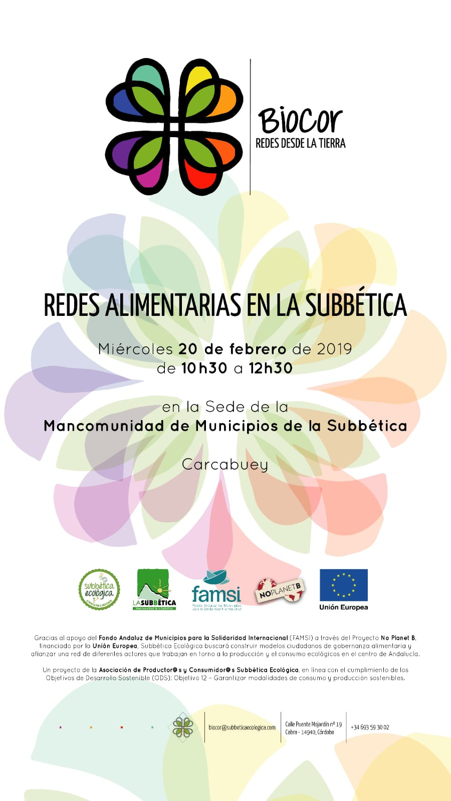 "Redes alimentarias en la Subbética" es una actividad que se enmarca en el proyecto "No Planet B" y se celebra el próximo día 20 de febrero a las 10:30 horas en la sede de la Mancomunidad de Municipios de la Subbética, en el municipio cordobés de Carcabuey. Aquí puedes descargar el cartel de la actividad.