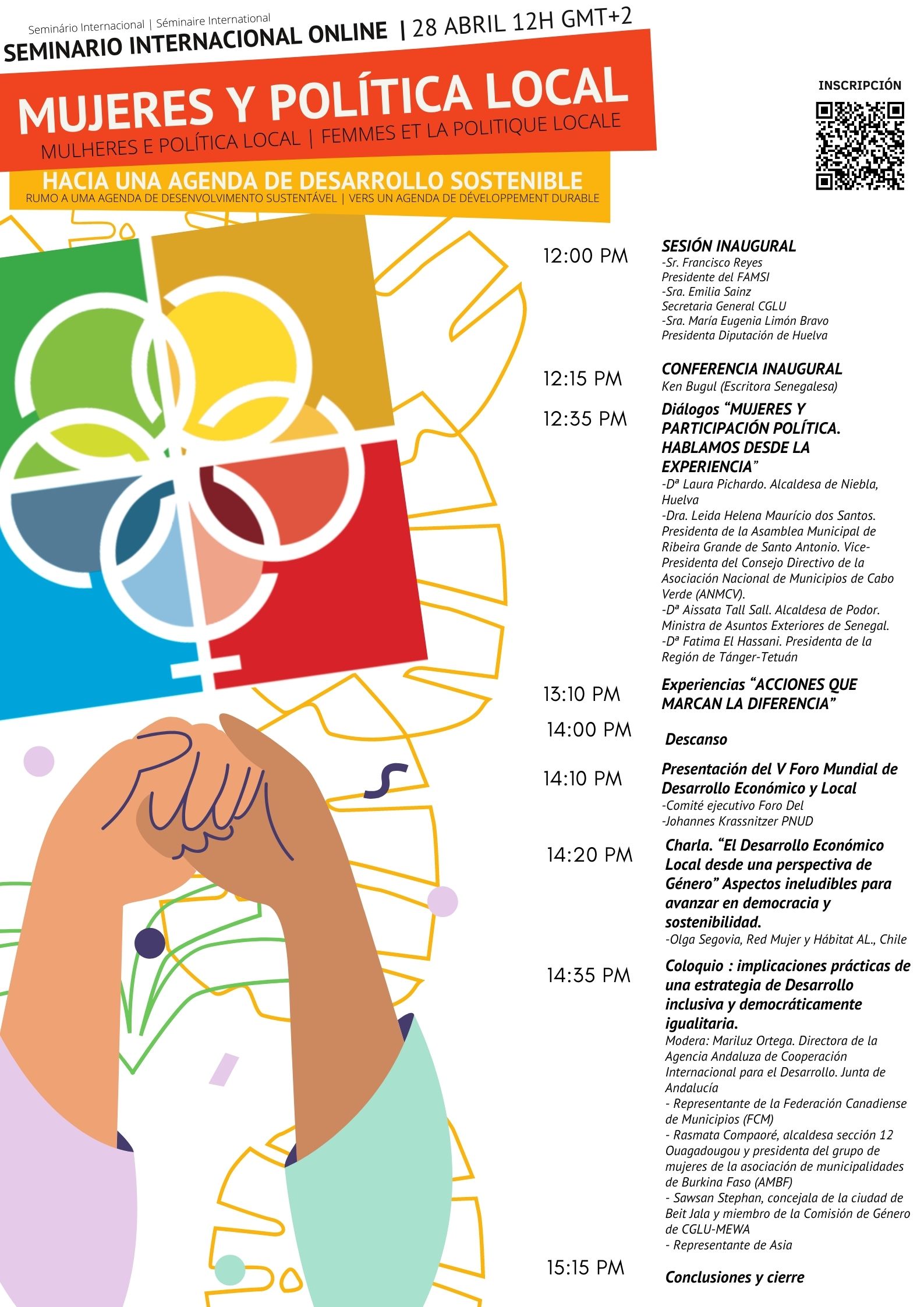 El Seminario internacional virtual 'Mujeres y política local: hacia una agenda de desarrollo sostenible' se celebra el día 28 de abril en dos sesiones: la primera a las 12 horas, organizada por el FAMSI, y la segunda a las 14:10, organizada por la Comisión de Desarrollo Económico y Social Local, en nombre del Comité Organizador del V Foro Mundial de Desarrollo Económico Local, e integrada en el programa de seminarios virtuales preparatorios del Foro. Puedes inscribirte en este enlace, y seleccionar en qué espacio quieres participar.