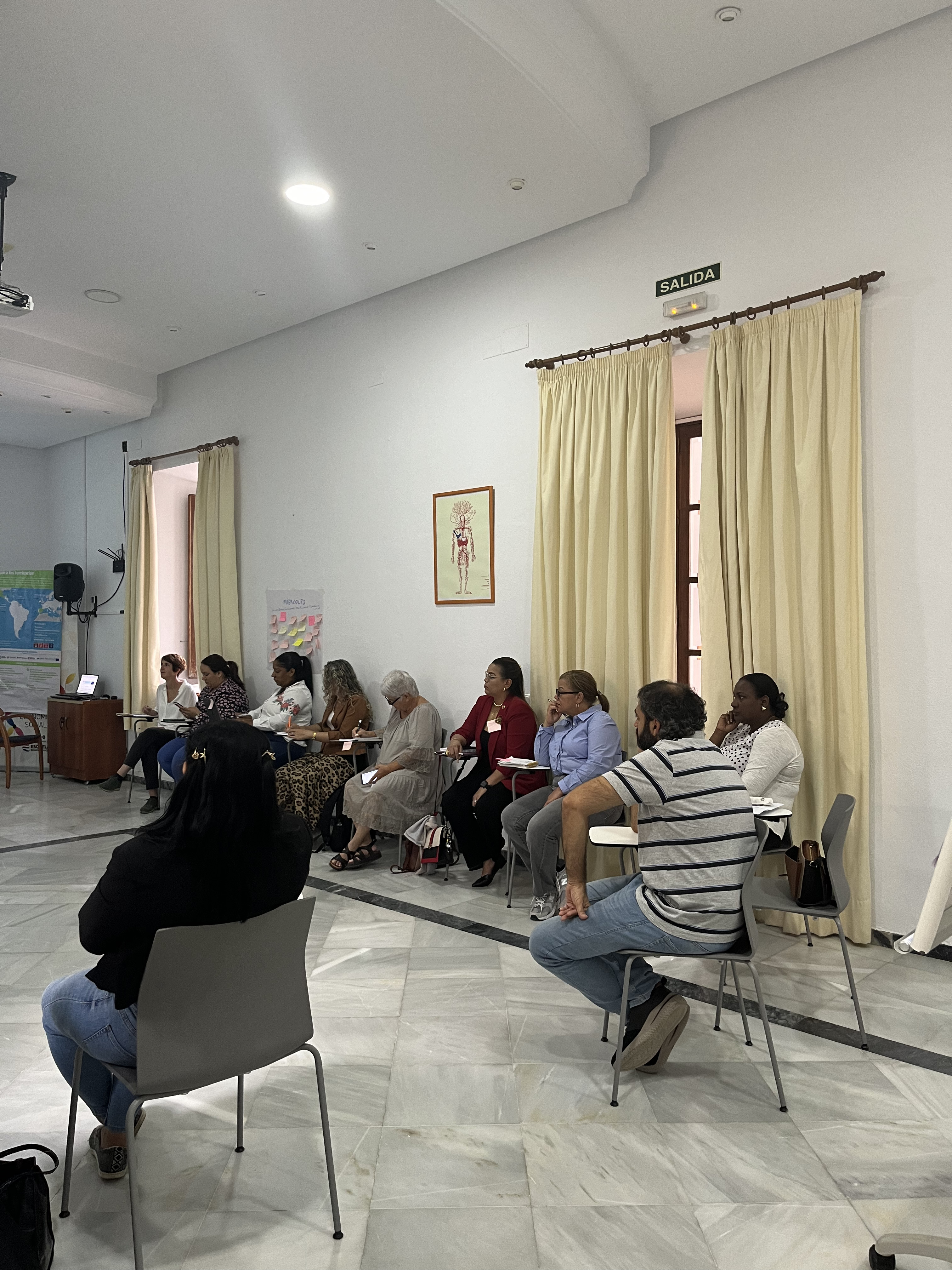La jornada de cierre tuvo lugar en la sede de Osuna de la Escuela de Economía Social y consistió en varias sesiones formativas que invitaron a la reflexión y el aprendizaje compartido. Entre estas actividades destacó el Taller de Finanzas Éticas e Inclusivas para el Emprendimiento, cuyo propósito fue sensibilizar sobre la importancia de las finanzas éticas en la economía social, promoviendo el empoderamiento colectivo y el manejo responsable de los recursos en el contexto de la cooperación y el apoyo mutuo. También se llevó a cabo el taller de Socialización de Visitas y Elementos Clave, donde los participantes reflexionaron sobre los aprendizajes obtenidos en los recorridos realizados a distintos emprendimientos y experiencias de economía social, identificando los puntos más destacados de la visita.