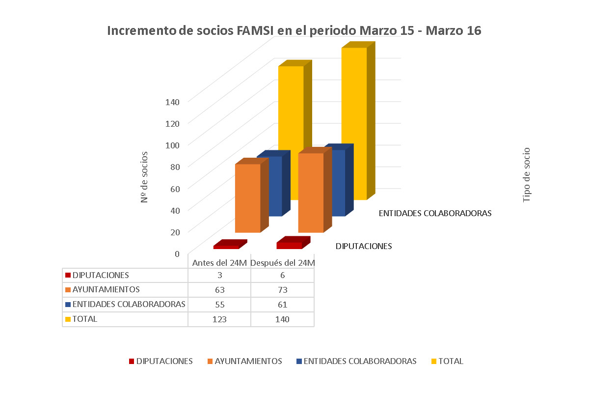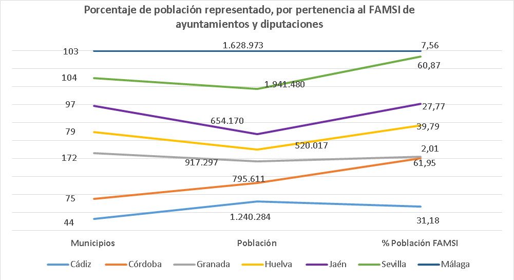En la actualidad forman parte del FAMSI 6 diputaciones andaluzas (Huelva, Cádiz, Granada, Jaén, Córdoba y Sevilla), 73 ayuntamientos y 61 entidades colaboradoras entre las que se encuentran organizaciones sociales, temáticas o sectoriales; del ámbito académico, 3 universidades forman parte del FAMSI en la actualidad, que mantiene convenios con otras tantas para la ejecución de programas formativos y de capacitación.