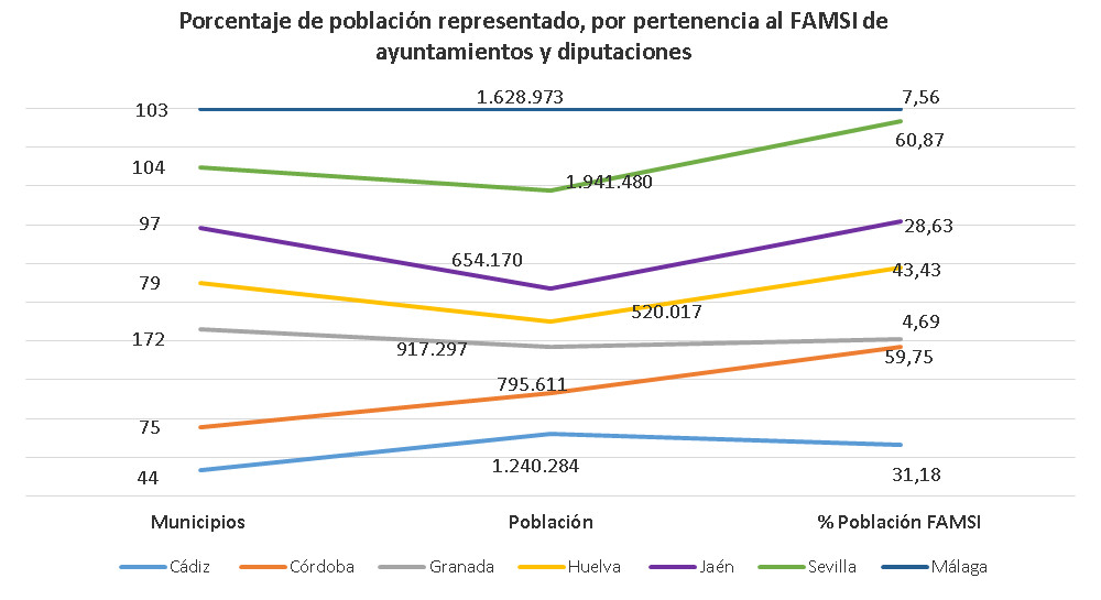 En la actualidad forman parte del FAMSI 6 diputaciones andaluzas (Huelva, Cádiz, Granada, Jaén, Córdoba y Sevilla), 79 ayuntamientos y 63 entidades colaboradoras entre las que se encuentran organizaciones sociales, temáticas o sectoriales; del ámbito académico, hay que destacar la presencia de tres universidades.