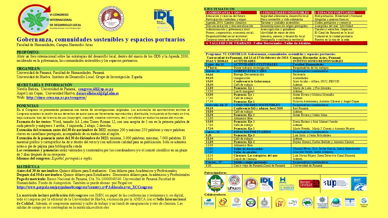 Bajo el epígrafe 'Gobernanza, comunidades sostenibles y espacios portuarios', se celebrará del 13 al 17 de febrero de 2023 en el campus Harmodio Arias de la Facultad de Humanidades de la Universidad de Panamá, con el patrocinio de la Diputación de Huelva, y la colaboración de FAMSI, la Universidad de Sevilla o el Grupo de Universidades Latinoamericanas La Rábida, entre otras entidades.