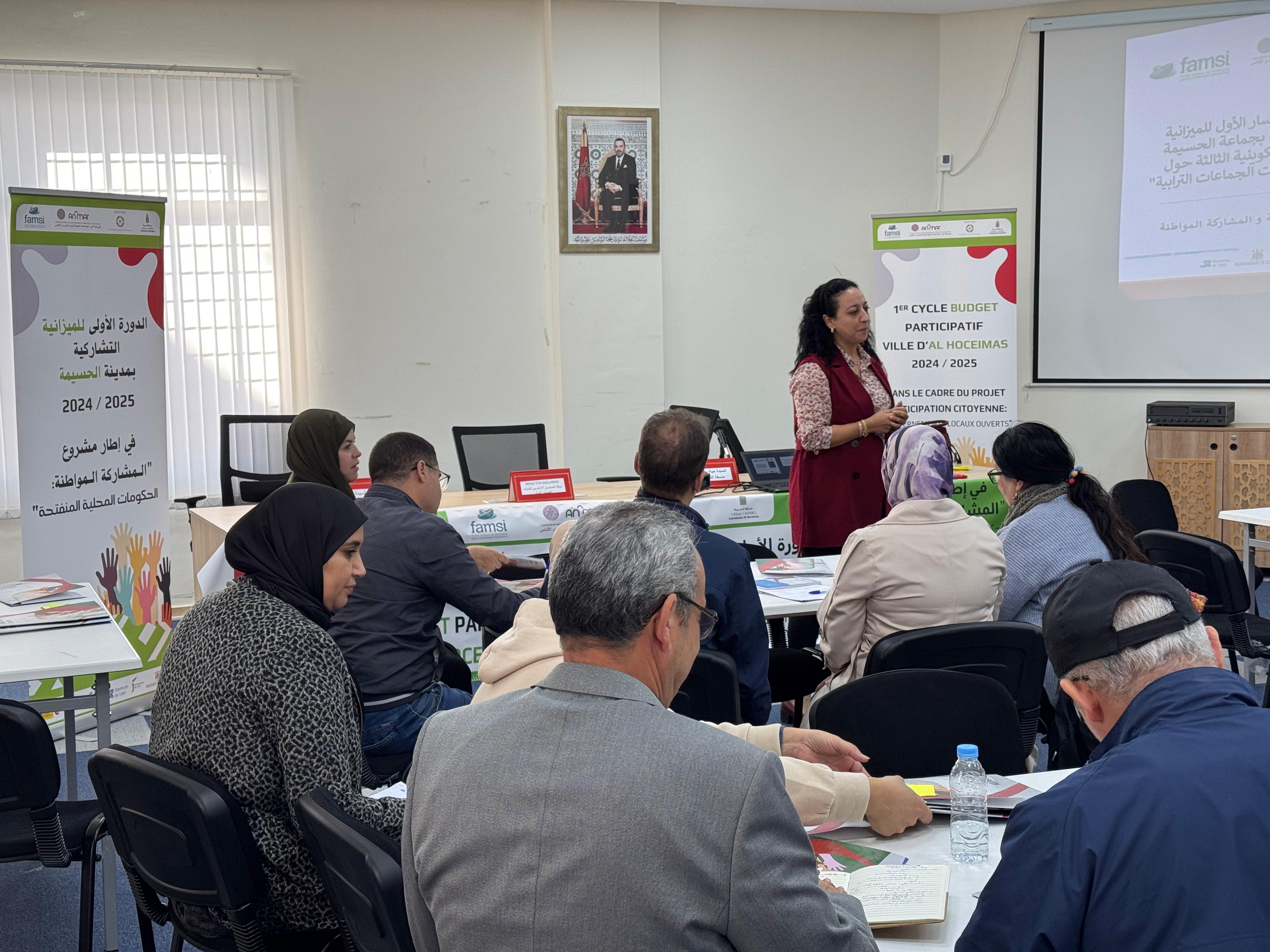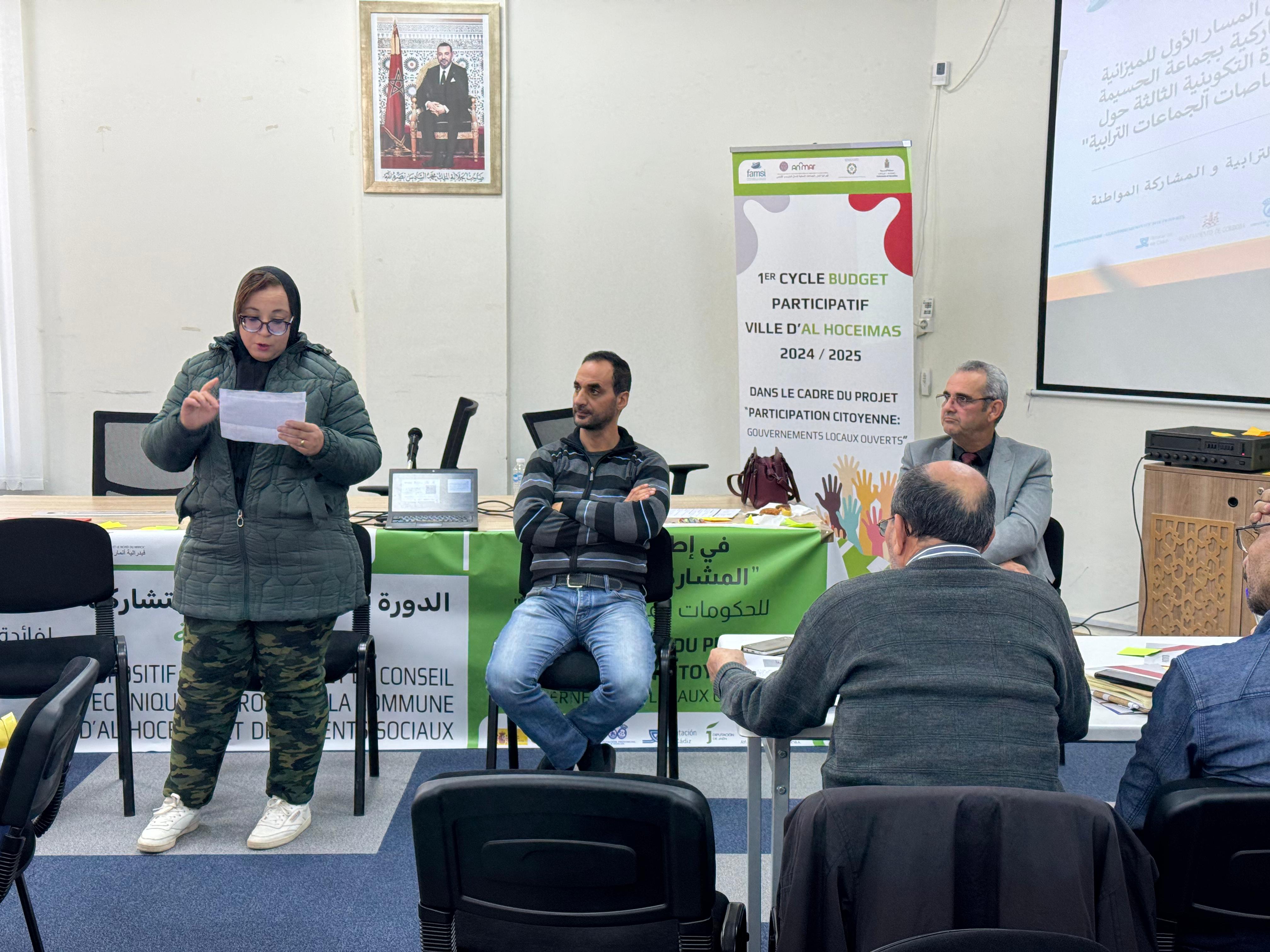 El pasado 4 de diciembre, una treintena de personas participaron en una sesión de formación y coaching bajo el tema “Las competencias del ayuntamiento y su plan municipal, pilares para la implementación del presupuesto participativo”. Se trata de la tercera sesión formativa organizada en la fase preparativa del presupuesto participativo de Alhucemas. El mensaje de bienvenida a las personas participantes ha venido de la mano de la teniente de alcalde, Hayat Boulahjel y las técnicas de proyectos de FAMSI y ANMAR, Eva Gallardo y Souhaila Al Laghdass.
