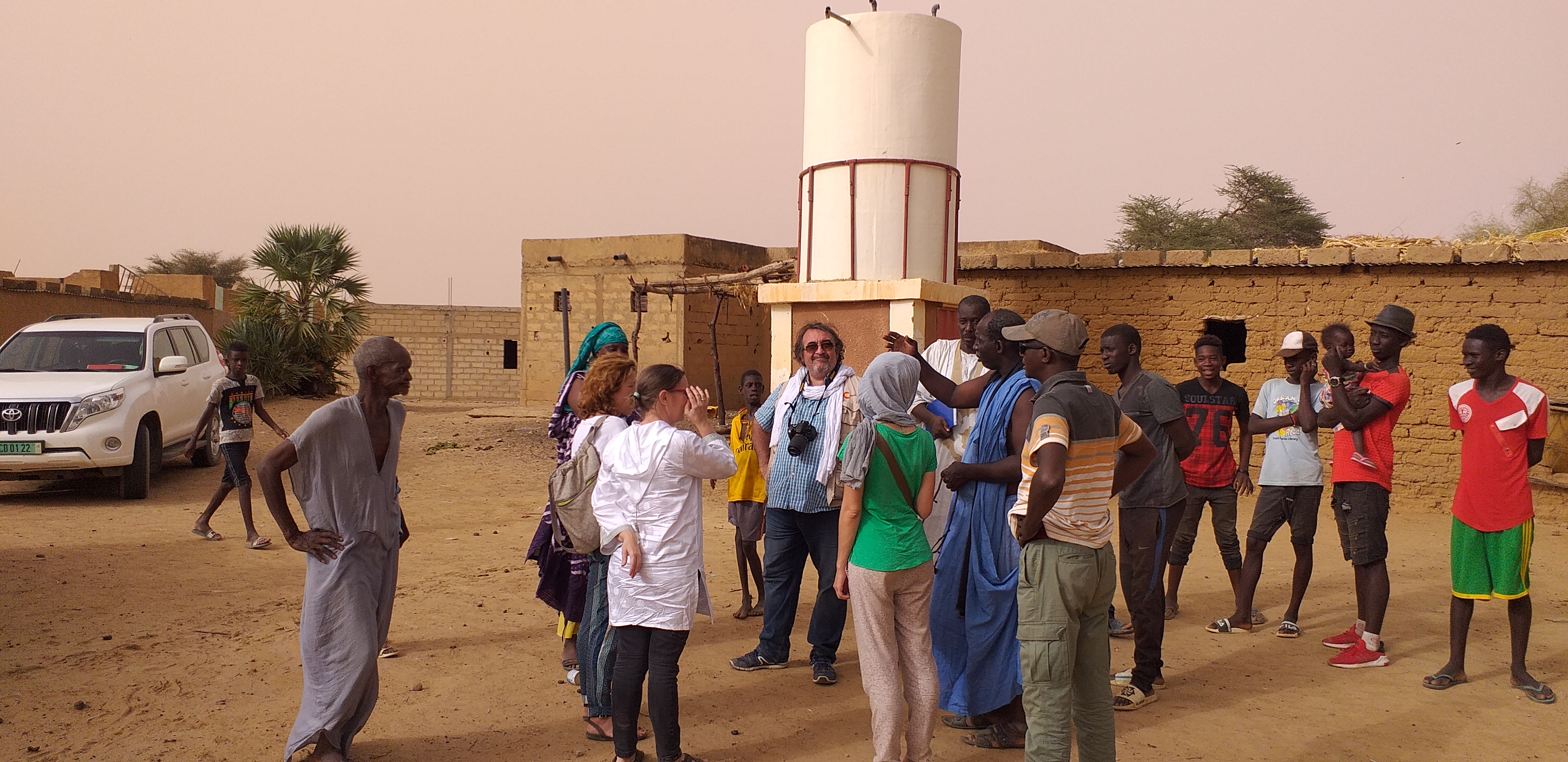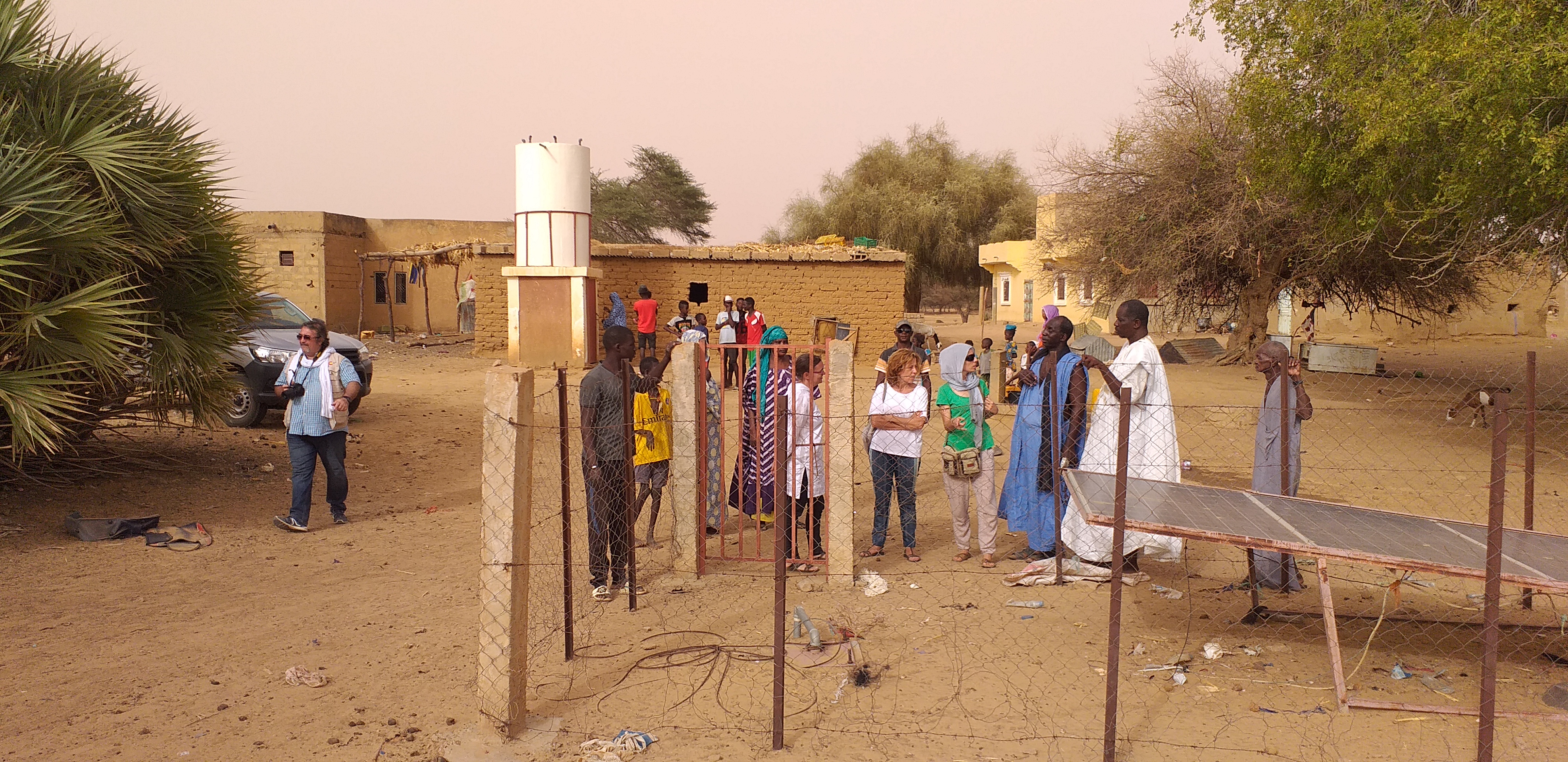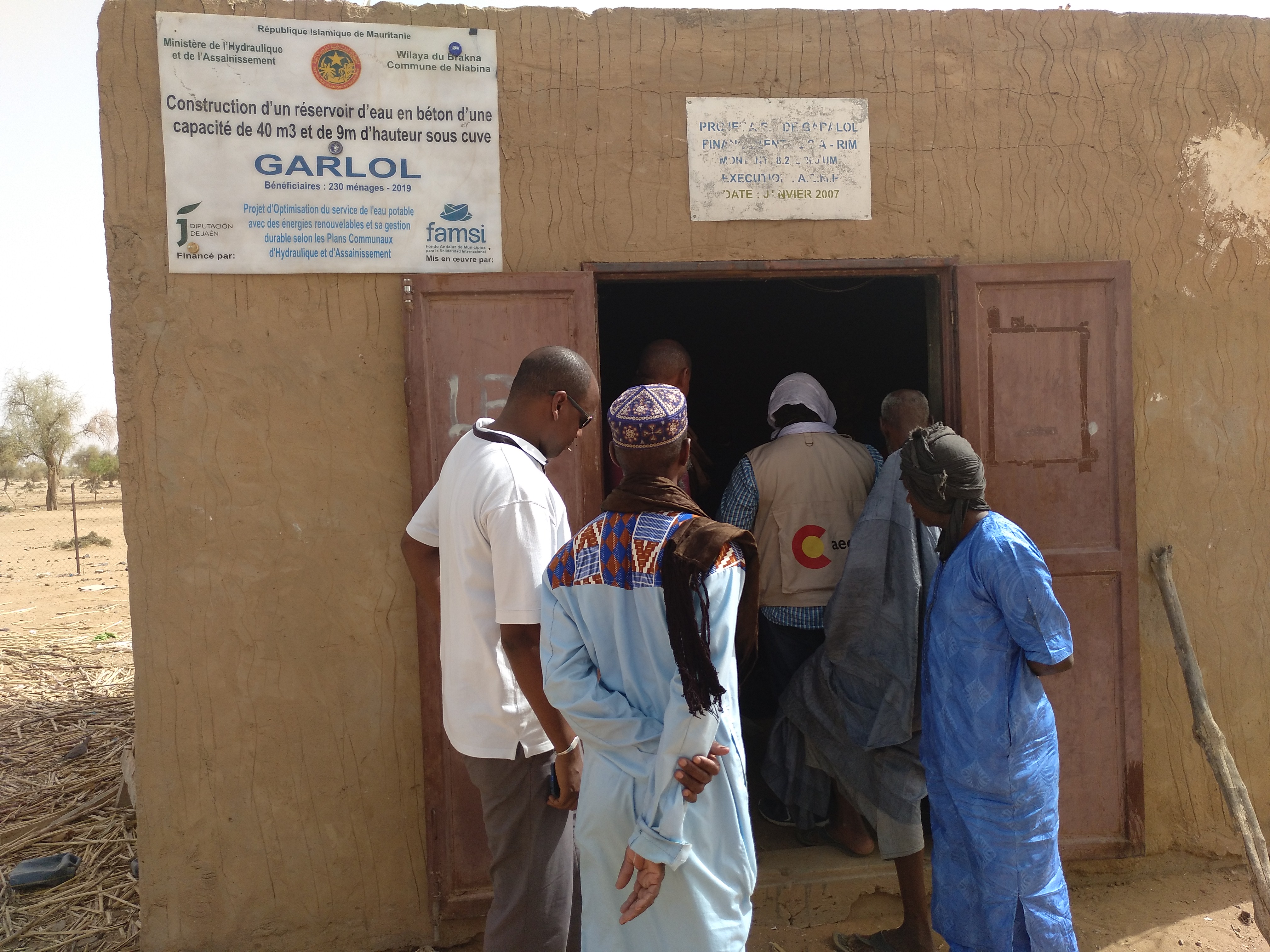 El equipo de la AECID también visitó un sistema de abastecimiento de agua en la localidad de Sara Souki, Comuna de Aere M’Bar, que ha sido recibido y acompañado por el alcalde adjunto de la Comuna, por el jefe del pueblo y las mujeres que forman parte del Comité de Gestión de Agua, compuesto íntegramente por mujeres. El sistema de Sara Souki es uno de los primeros modelos de abastecimiento de agua diseñado para pequeñas localidades, modelo que posteriormente se ha divulgado en toda Mauritania, que se basa en una perforación manual y energía solar para el bombeo.