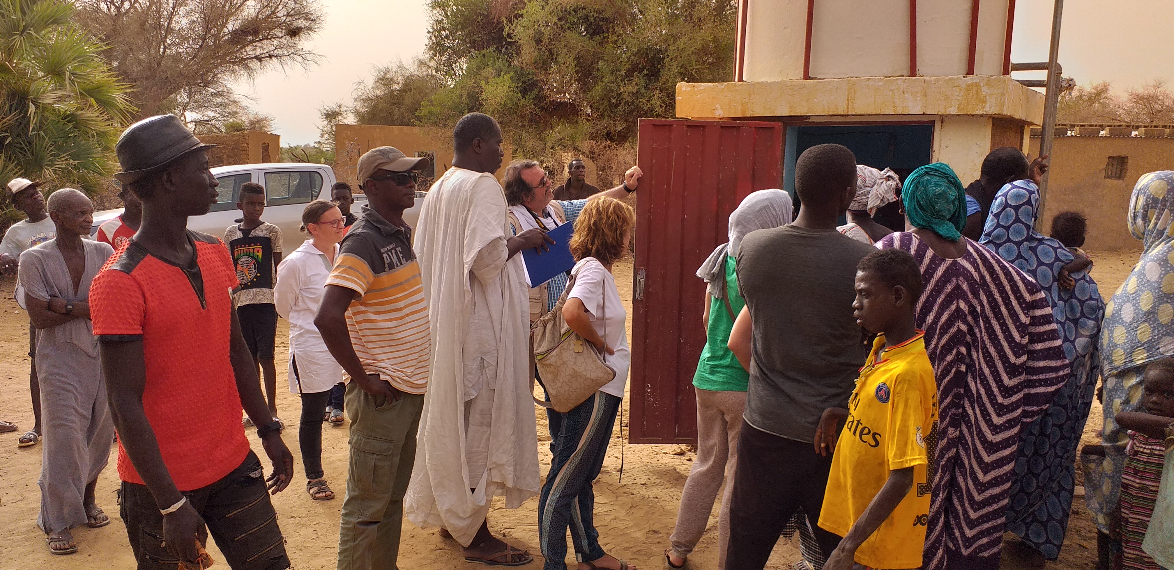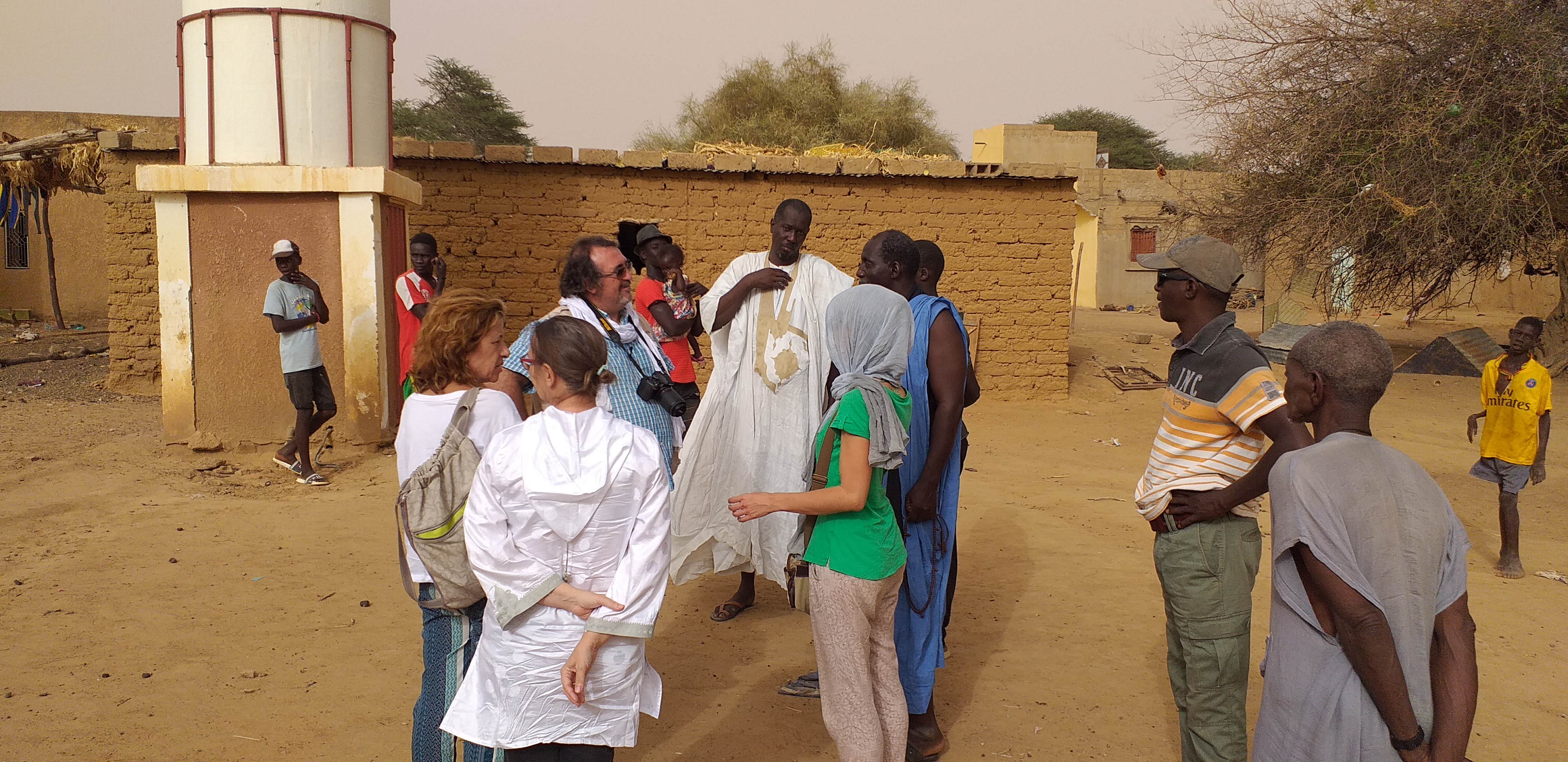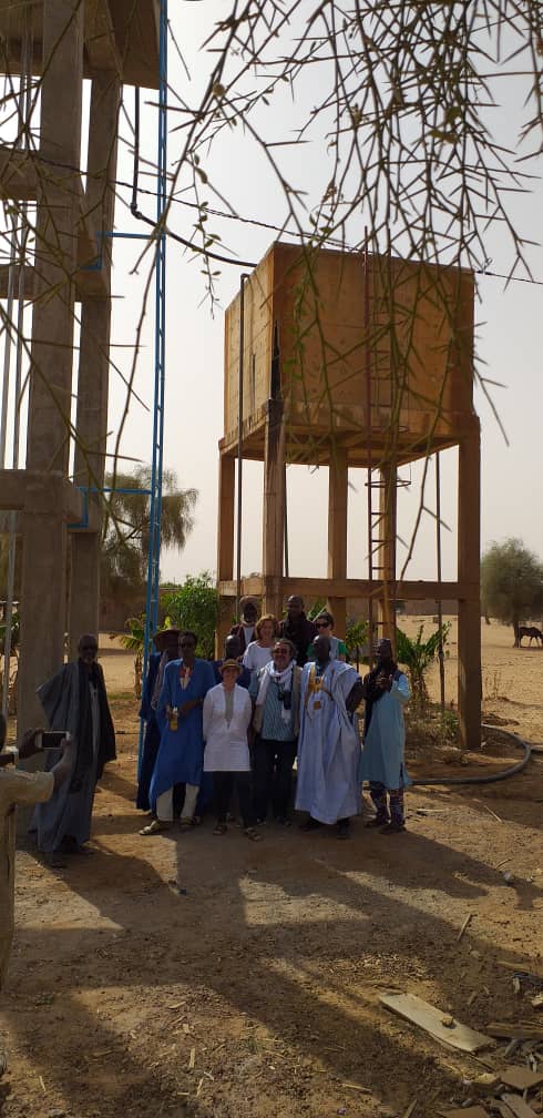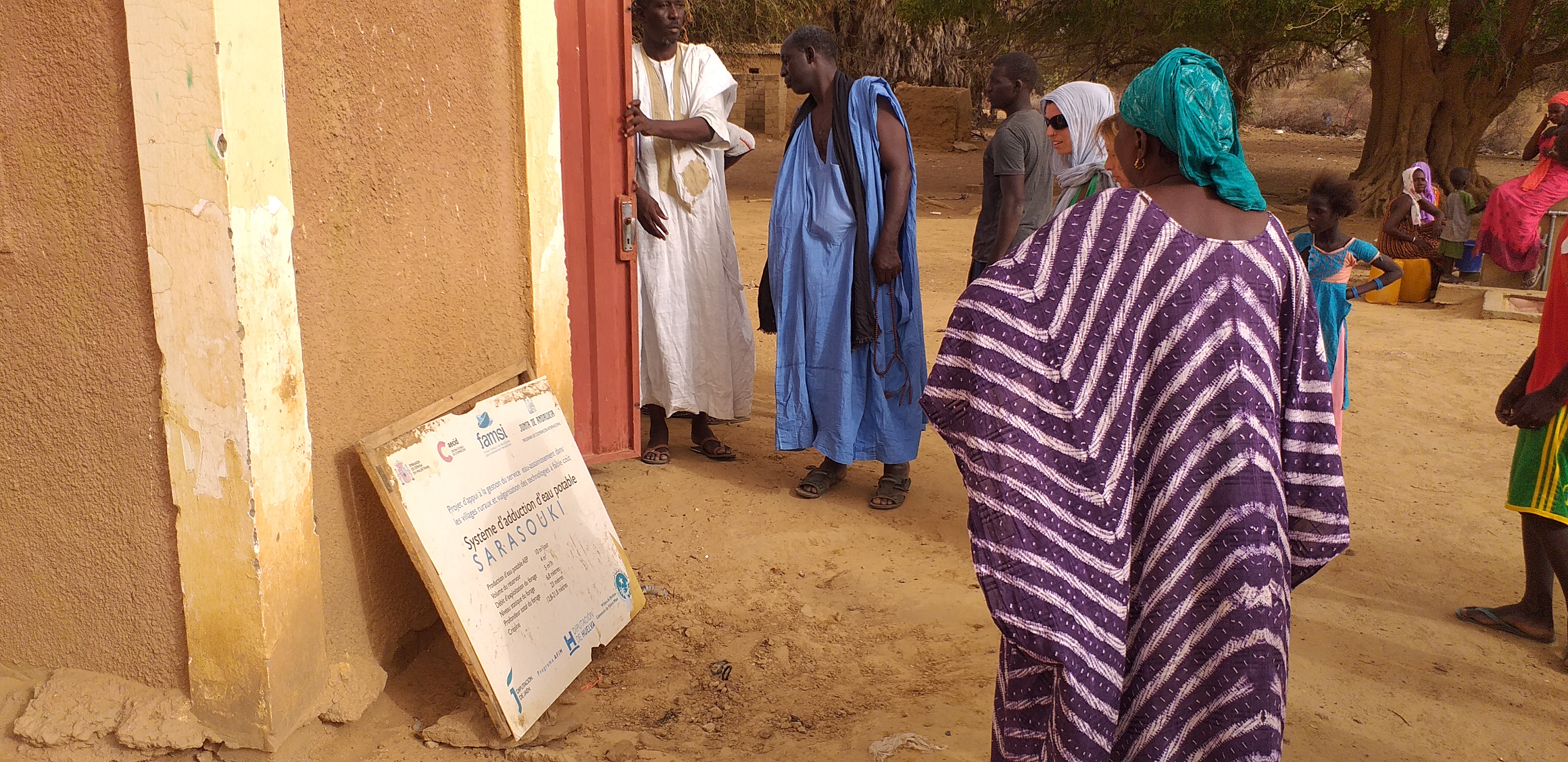 El equipo de la AECID también visitó un sistema de abastecimiento de agua en la localidad de Sara Souki, Comuna de Aere M’Bar, que ha sido recibido y acompañado por el alcalde adjunto de la Comuna, por el jefe del pueblo y las mujeres que forman parte del Comité de Gestión de Agua, compuesto íntegramente por mujeres. El sistema de Sara Souki es uno de los primeros modelos de abastecimiento de agua diseñado para pequeñas localidades, modelo que posteriormente se ha divulgado en toda Mauritania, que se basa en una perforación manual y energía solar para el bombeo.