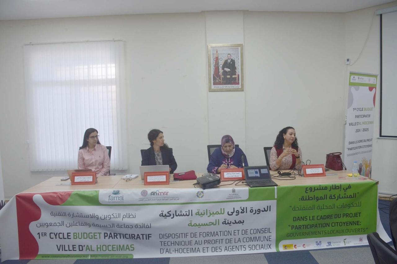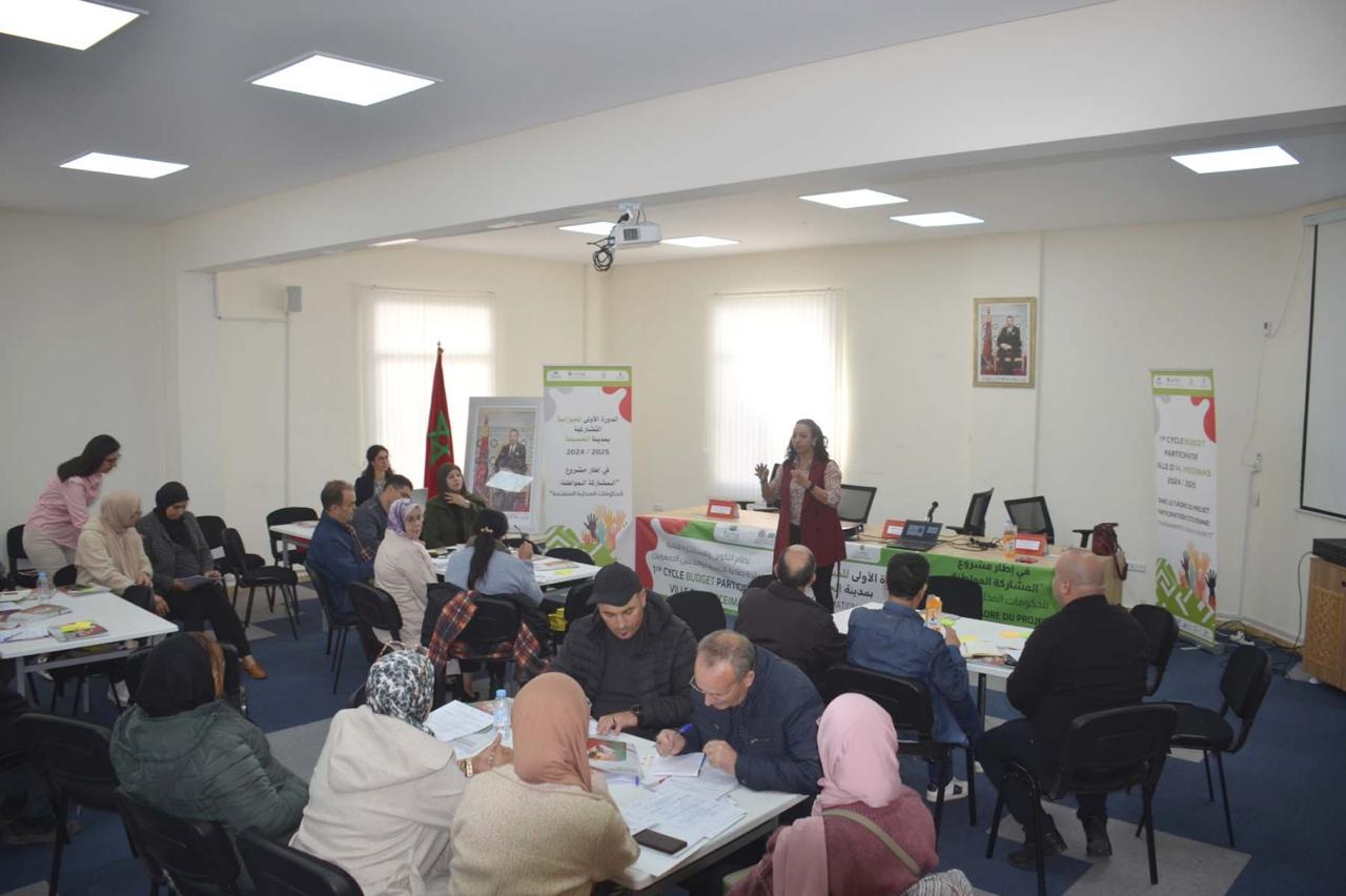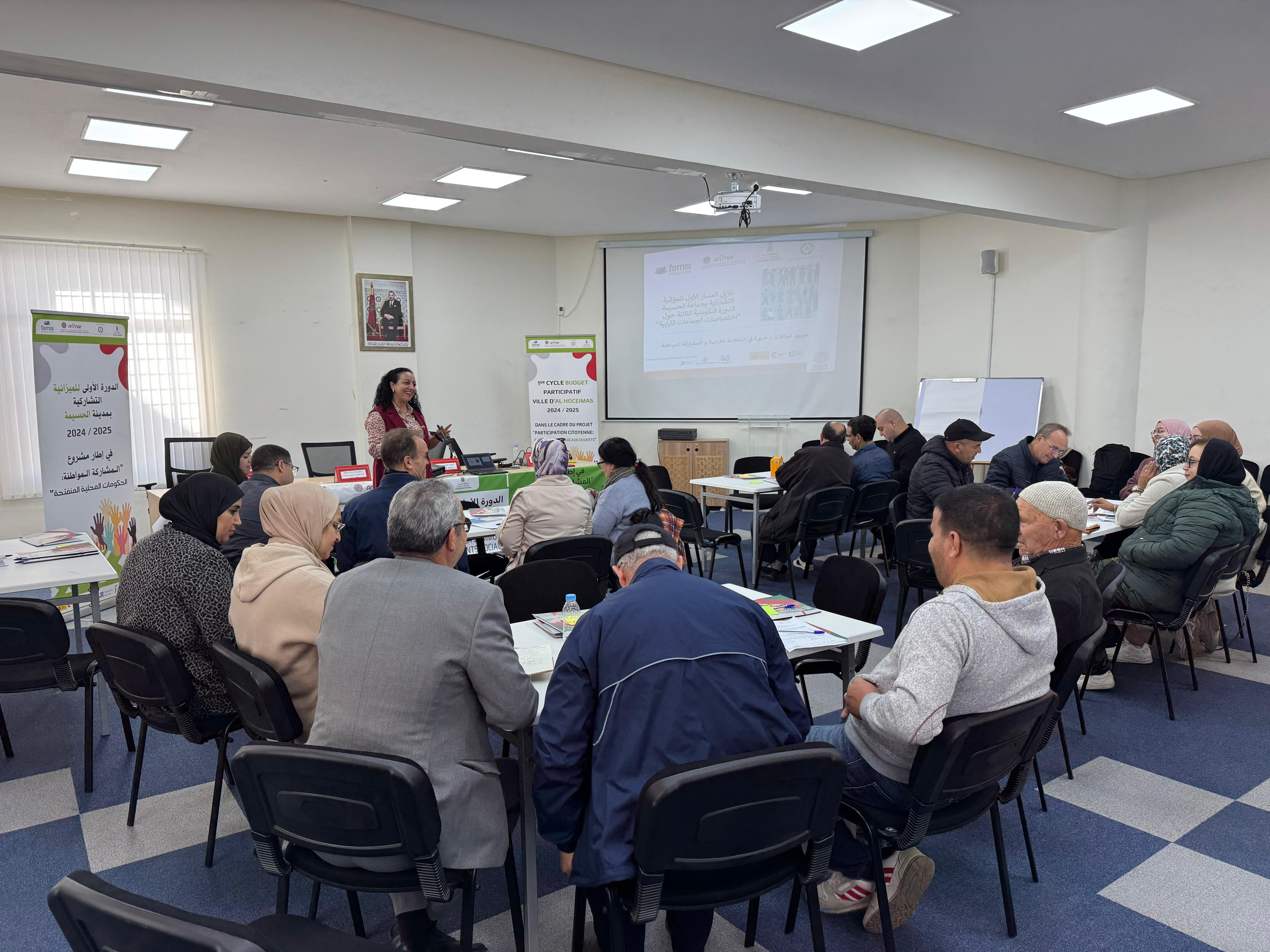 El pasado 4 de diciembre, una treintena de personas participaron en una sesión de formación y coaching bajo el tema “Las competencias del ayuntamiento y su plan municipal, pilares para la implementación del presupuesto participativo”. Se trata de la tercera sesión formativa organizada en la fase preparativa del presupuesto participativo de Alhucemas. El mensaje de bienvenida a las personas participantes ha venido de la mano de la teniente de alcalde, Hayat Boulahjel y las técnicas de proyectos de FAMSI y ANMAR, Eva Gallardo y Souhaila Al Laghdass.