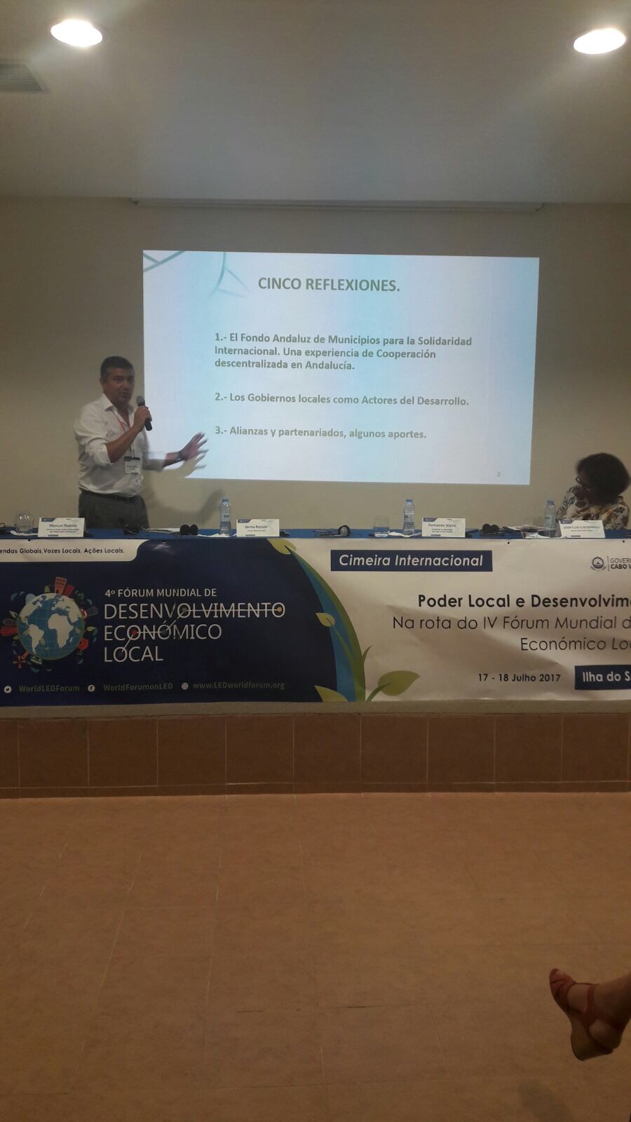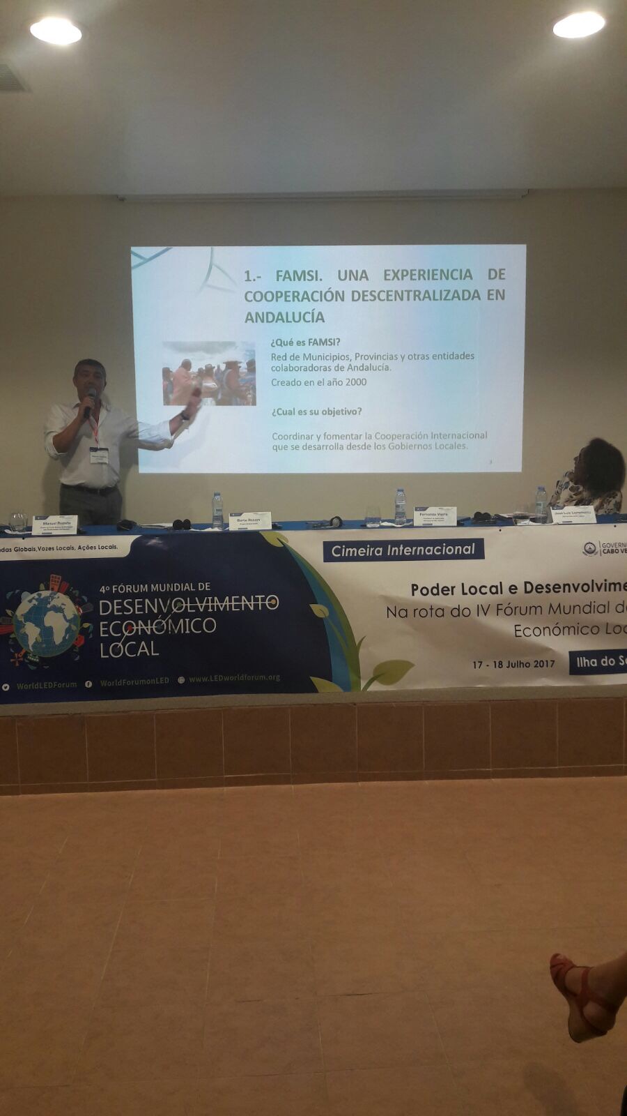 "Poder Local y Desarrollo Sostenible". Es el título del seminario que se ha celebrado en la Isla de la Sal (Cabo Verde) los días 17 y 18 de julio, en la ruta hacia IV Foro Mundial de Desarrollo Económico y Local (DEL), que tendrá lugar también en Cabo Verde, del 17 al 20 de octubre de 2017, con la participación del FAMSI, una de las entidades organizadoras de este evento internacional. En el seminario previo, Manuel Redaño, gerente del Fondo Andaluz de Municipios, expuso el protagonismo del desarrollo local sostenible en la agenda de trabajo de la entidad, dentro y fuera del territorio andaluz.